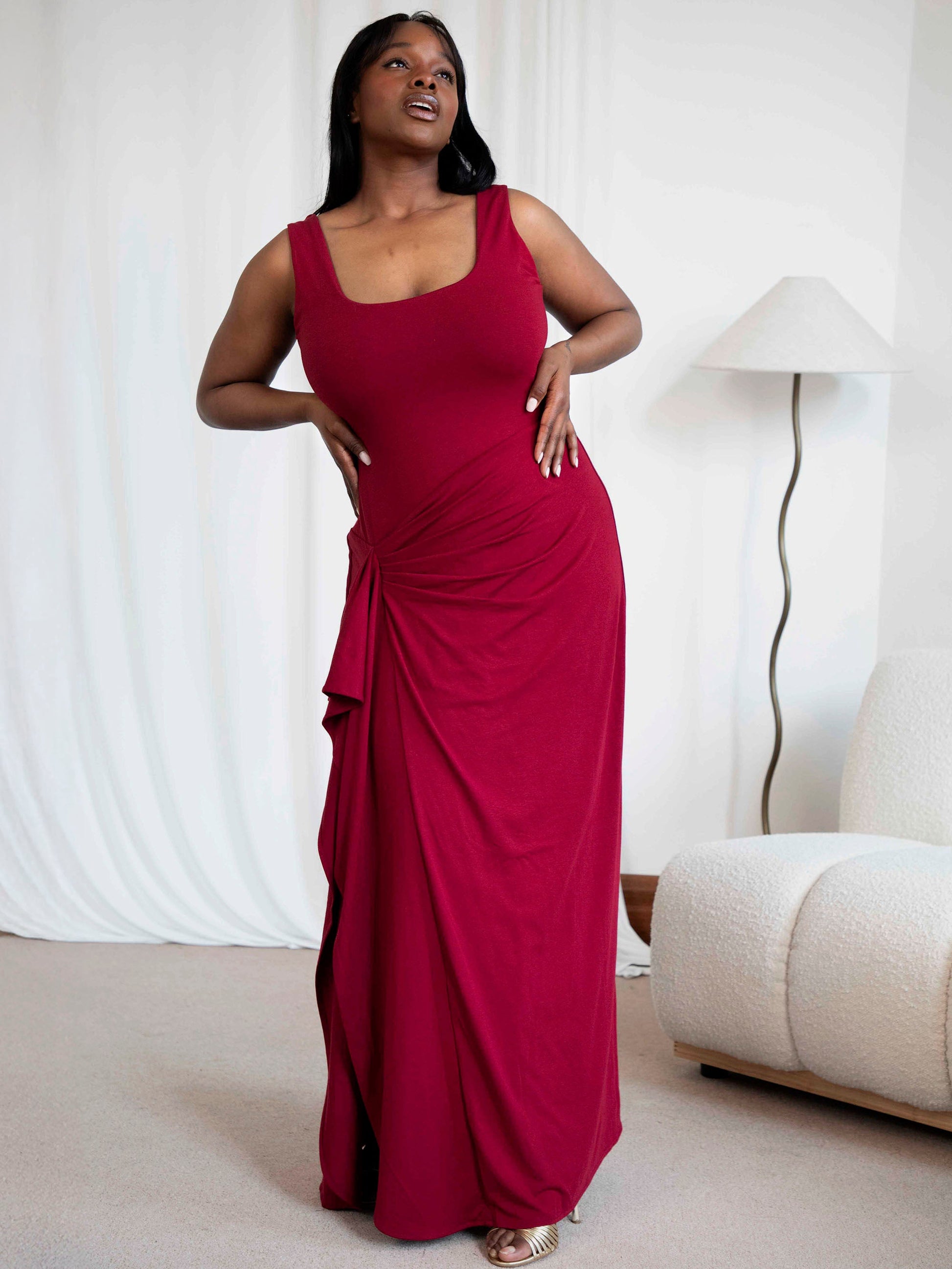Every aspect of our figure-hugging Athena Dress is designed to make you feel incredible. It’s crafted from a double-layered, stretch jersey fabric, to create the smoothing, sculpting effect of shapewear without compromising on comfort, with flattering ruching over the tummy area. The scoop neckline is bra-friendly, but also offers light support if you prefer to go without. And for just the right amount of drama, we’ve added a thigh-high split under a cascading waterfall ruffle.