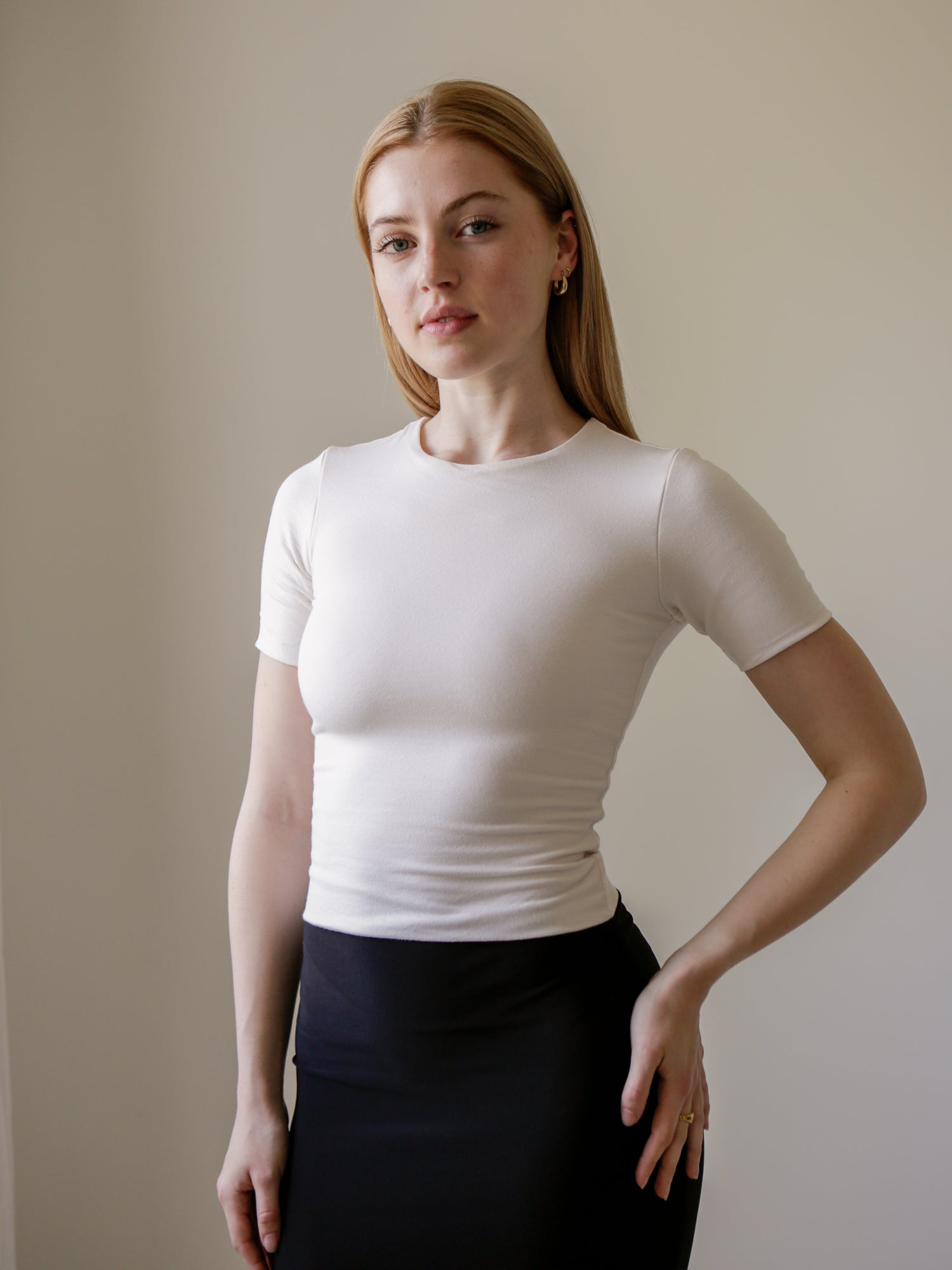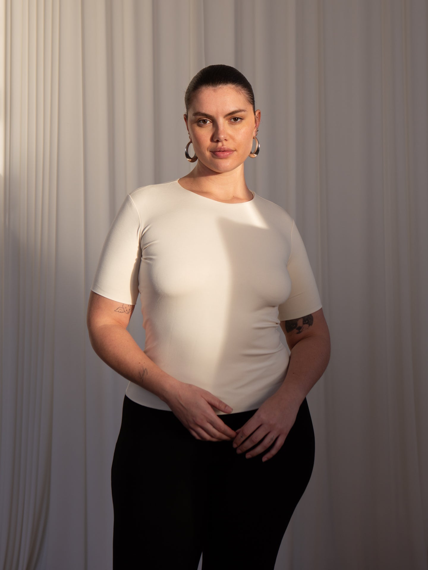 Our 'Bourne' T-Shirt is the ultimate wardrobe staple that will provide you with unlimited style options with ease. It's a timeless silhouette made in a double-layered fabric that works like shapewear.