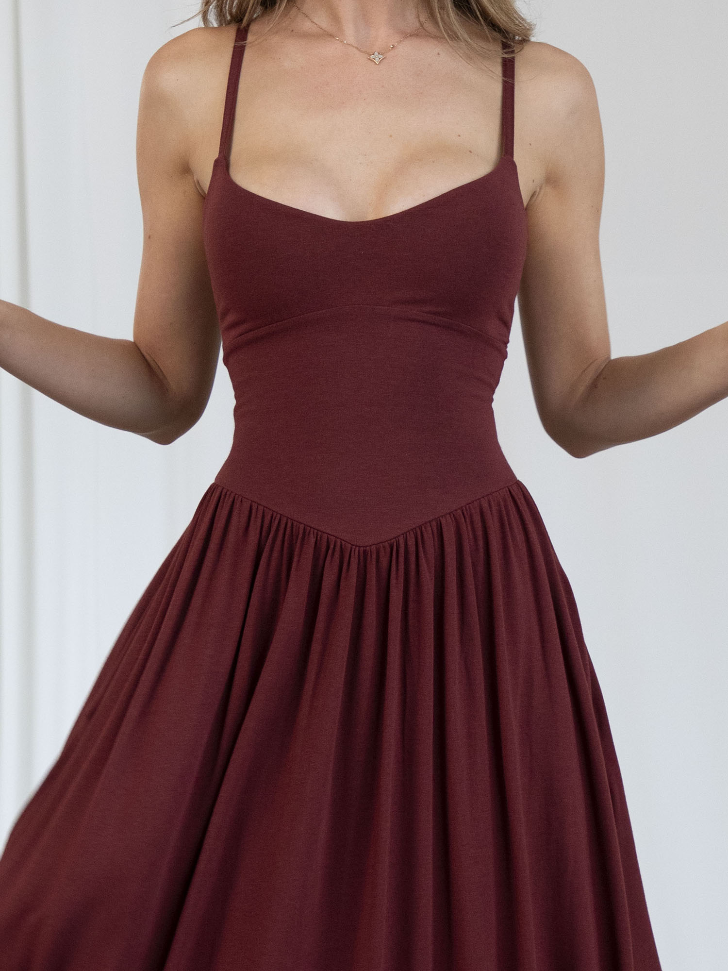 Designed with a flattering subtle basque waist and full, floaty skirt, Cammie lets you move with grace and ease. The soft, double-layered stretch fabric is smoothing and comfortable, and the corset-style waist ties allow you to personalise the fit. Delicate, adjustable straps offer just the right amount of support, plus there’s the option to add discreet bra cup inserts. And, of course, she has pockets - because every great dress should.