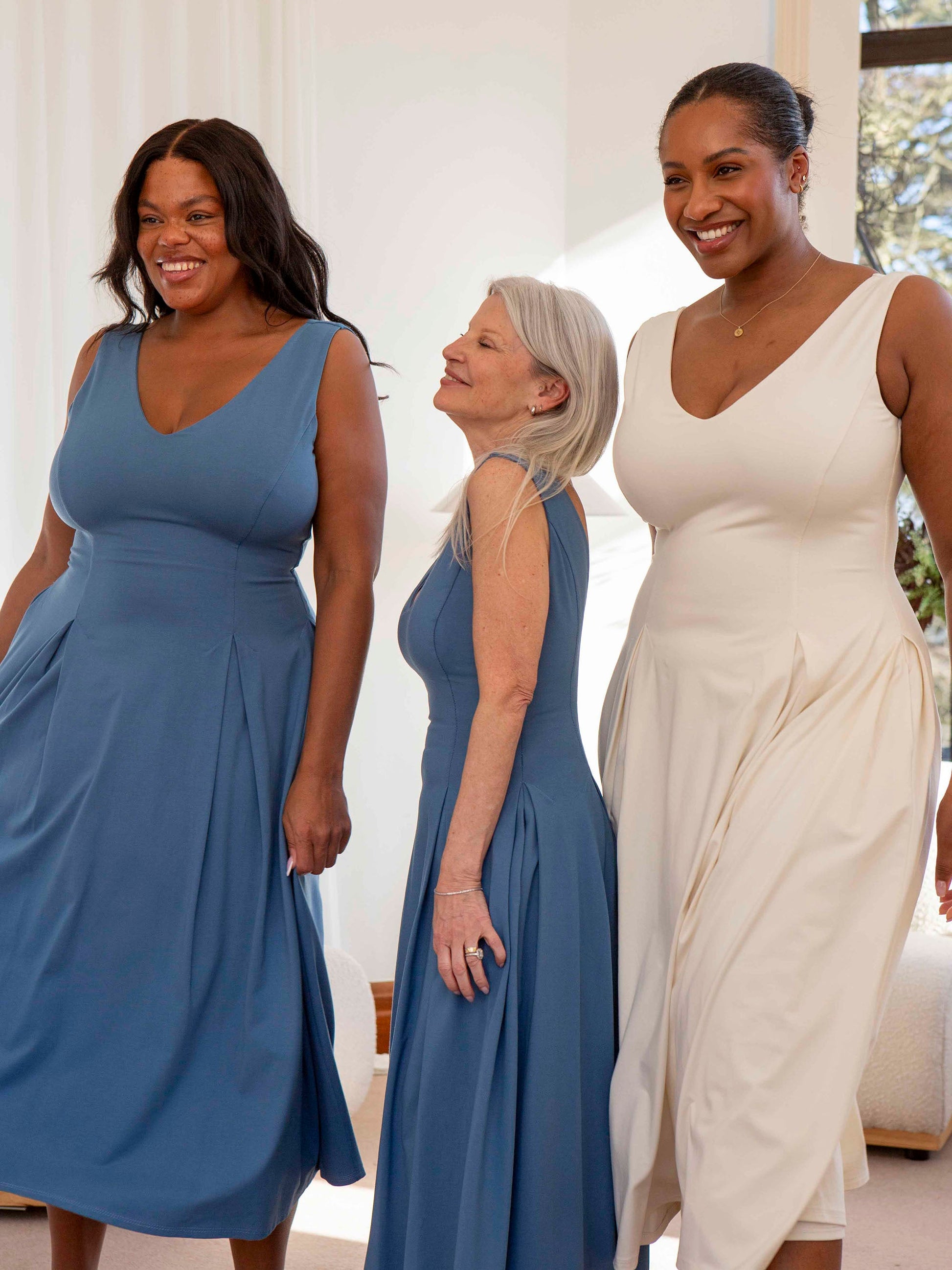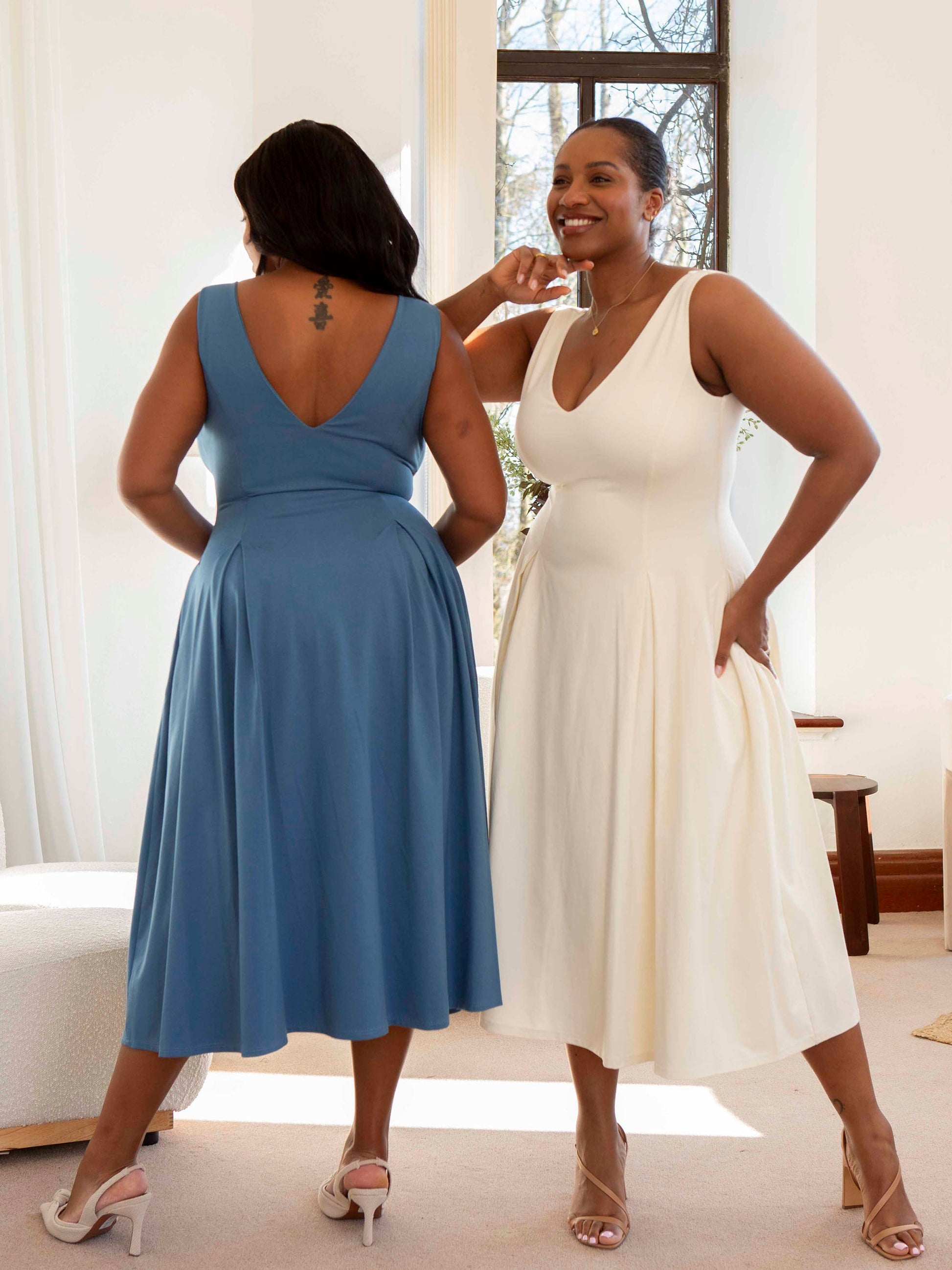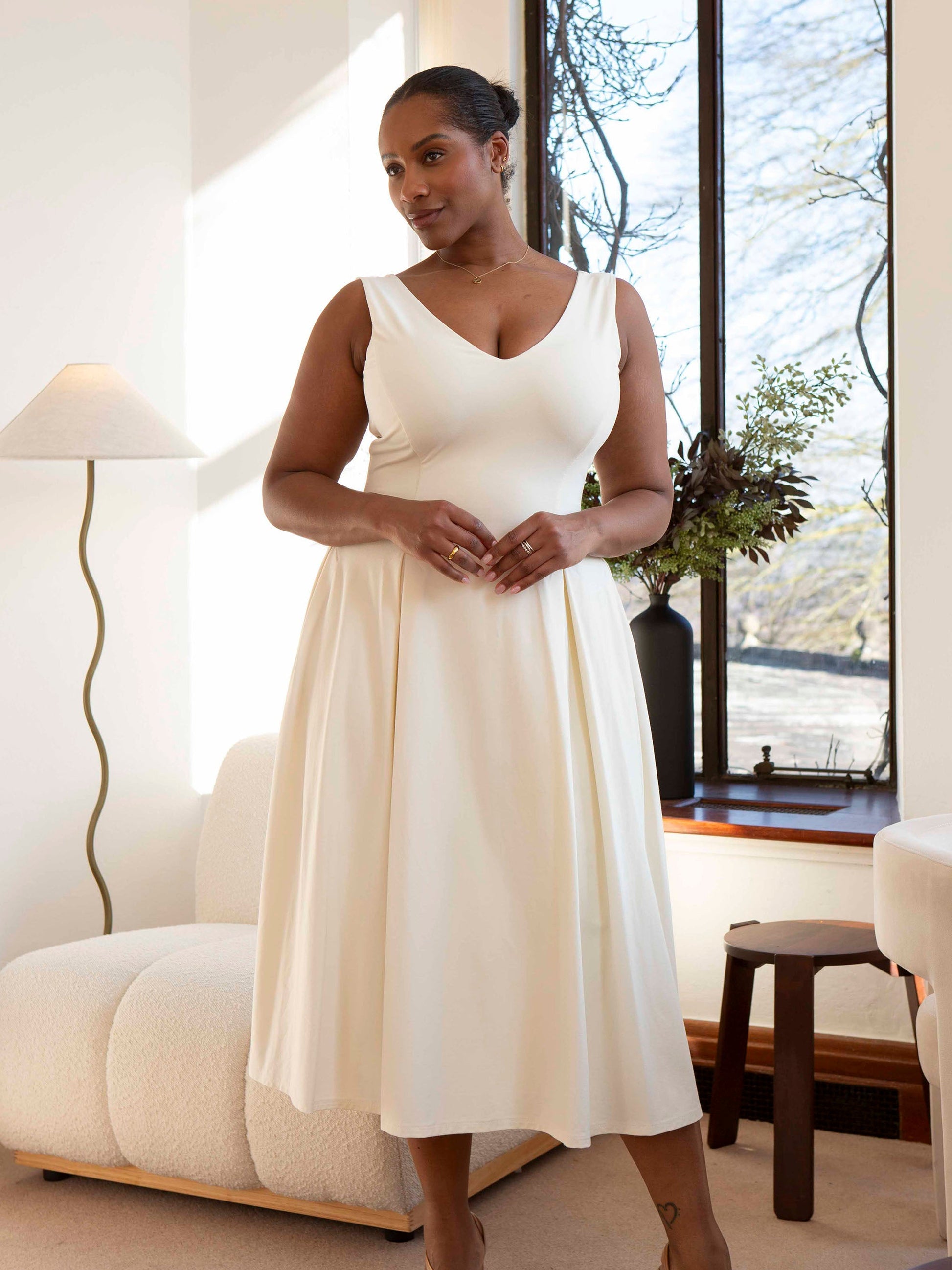 Our elegant Chelsea Dress is flattering, comfortable and thoughtfully designed to make you feel incredible. Crafted from our heaviest cotton and bamboo material, it provides full coverage and a sculpting fit with swishy movement through the pleated midi skirt. The silhouette is bra-friendly but, if you prefer to go without, the structured bodice offers plenty of support for any cup size.Â