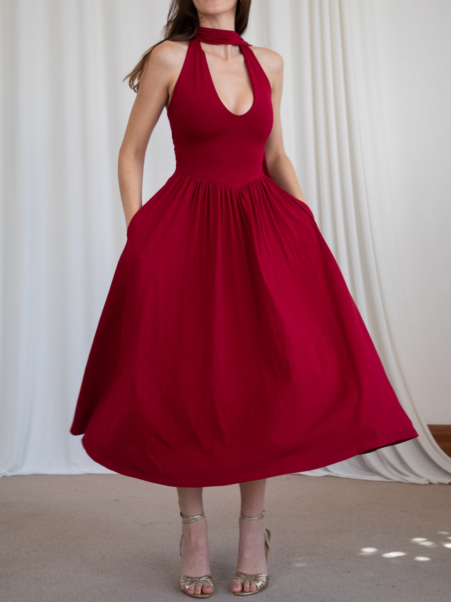 Our signature double-layered stretch fabric hugs your body comfortably through the bodice before flowing into a full, floaty midaxi-length skirt. The subtle basque waist and corset ties softly define your silhouette and make it easy to adjust the fit. Wide, adjustable halterneck ties invite you to style Cleo your way - knotted in a statement bow or crossed at the front for a modern twist. She’s a dress you’ll reach for again and again.